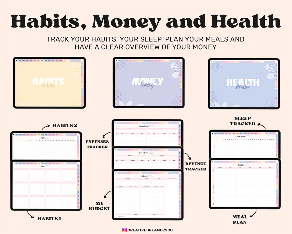 Start organizing your life and business with this beautiful and functional hyperlinked digital planner. You will have everything in one place. You can plan your year, months, weeks and days. Track your habits, your sleep, have a clear overview of your money and much more...